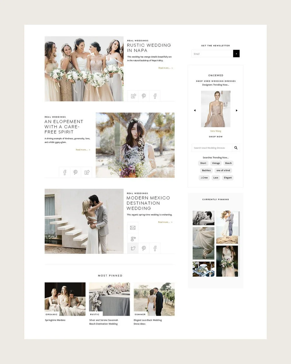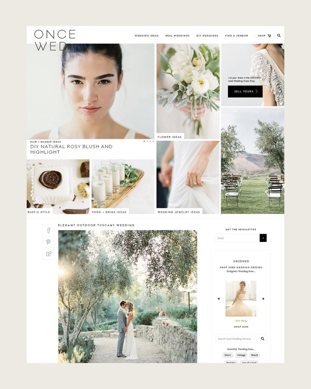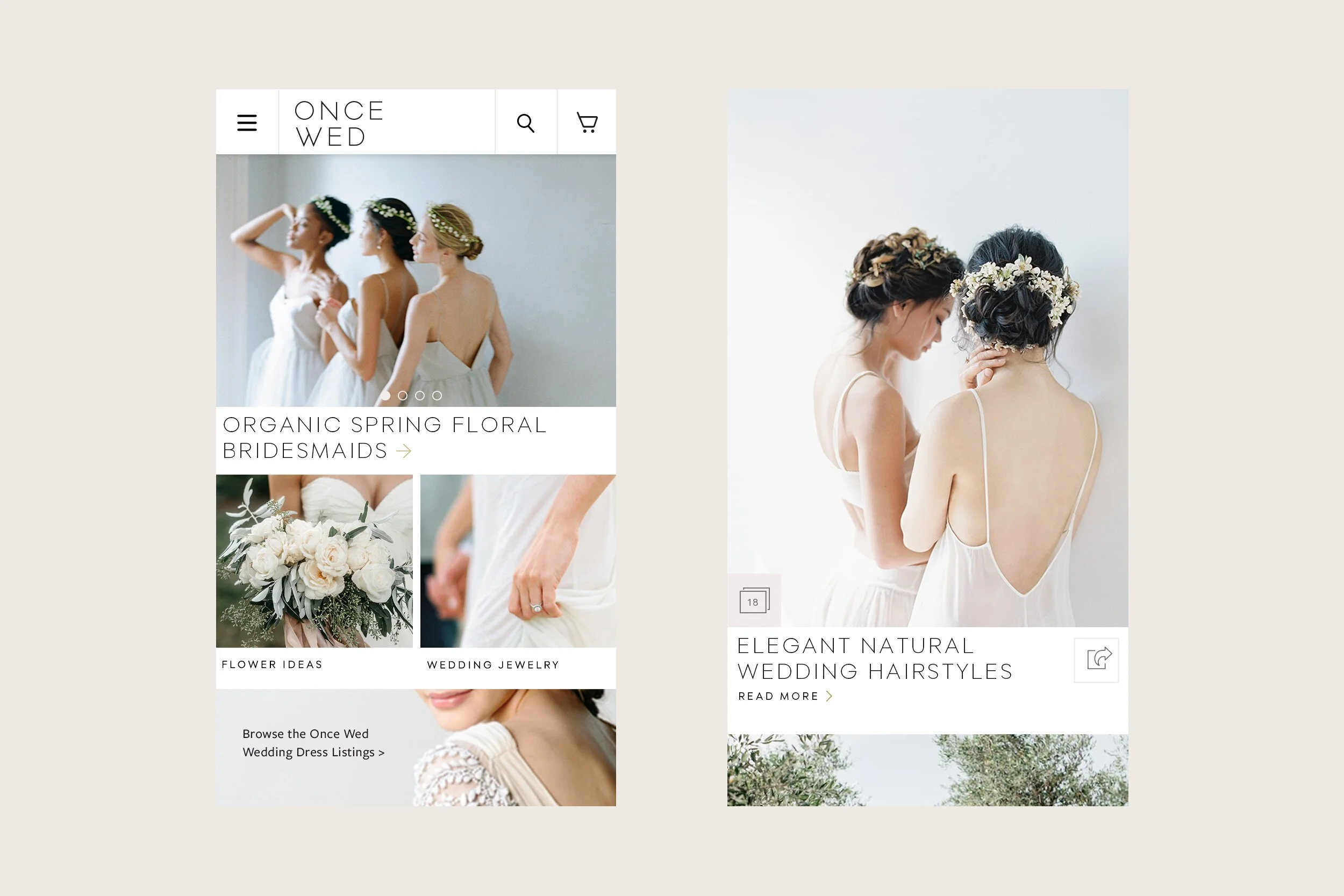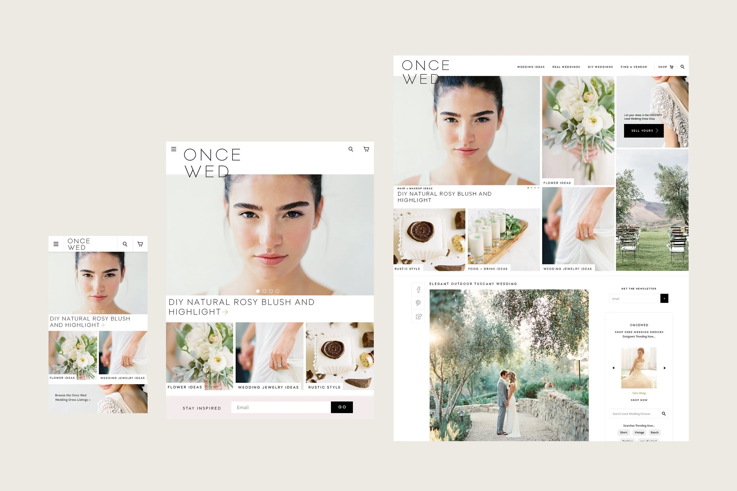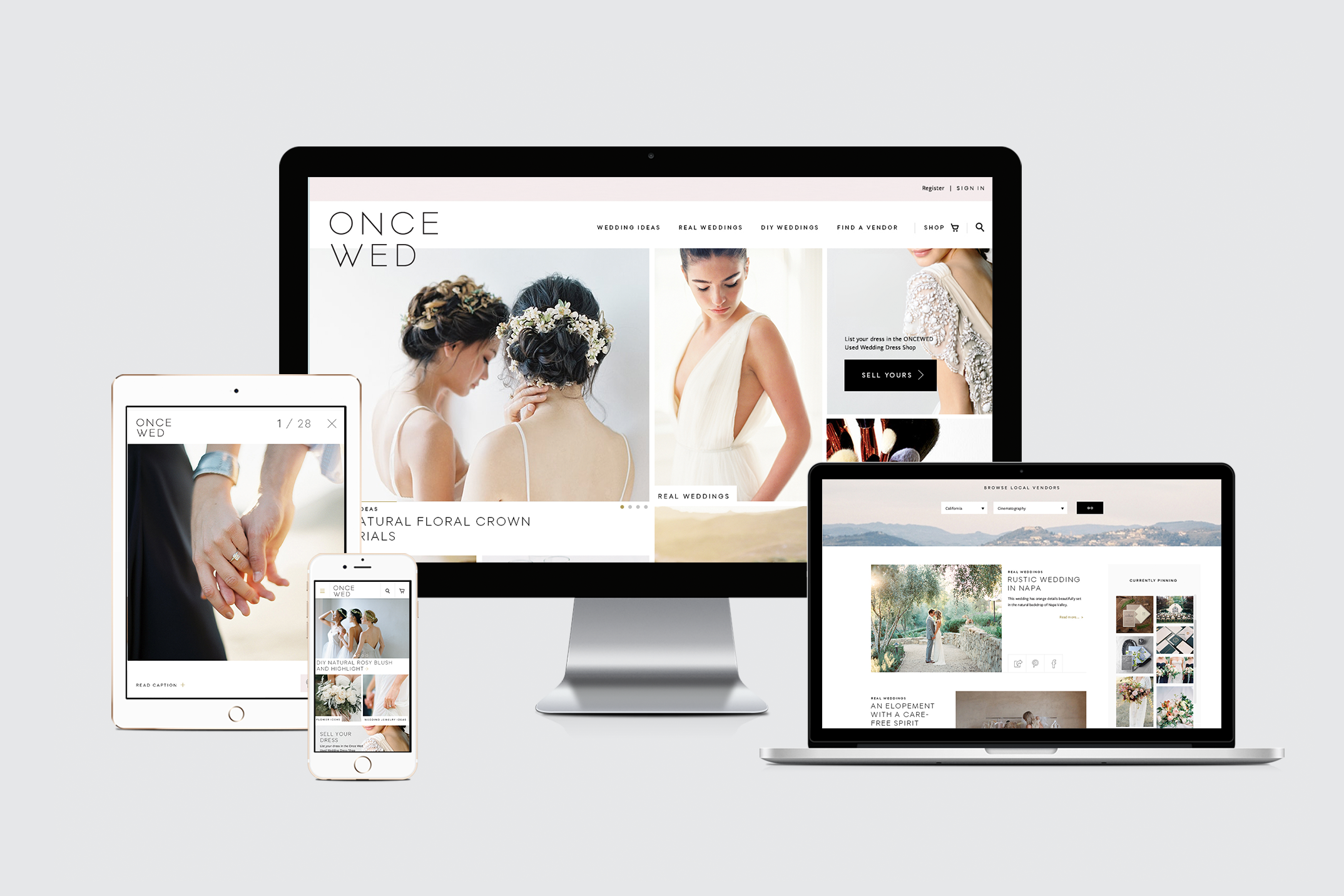 OnceWed is a leading wedding inspiration blog that delights in simple, organic imagery with a twist of the artistic and innovative– infusing beautiful design with meaning and emotion. After image curation, we developed branding and a custom responsive Wordpress and E-commerce website design that reflects the community's aesethetic of modern minimal sophisticated with sparks of surprise and joy.