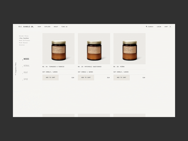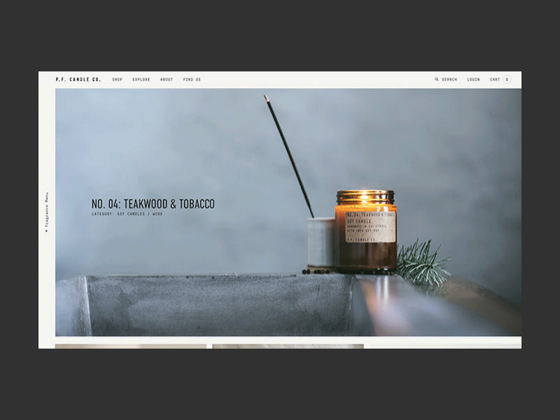 The Challenge – Over time, P.F. Candle Co.'s branding had become fragmented, with multiple logo versions and lack of comprehensive brand guidelines– issues that resulted in losing touch with the brand's core identity. The challenge was to distill the brand back to its essence and develop it to be richer. This involved a strategic audit of the brand's visual elements, leading to the discontinuation of newer logo versions in favor of a refreshed and refined logo design closer to the original stamp. The brand suite of fonts and colors was redefined to reinforce the cohesive branding found on the original packaging. Additionally, the product lineup was curated to focus on standout offerings and themes for browsing fragrances. We developed art direction to tell the story of the rustic scents, their mood and their ingredients. We designed and developed a fully custom Shopify website to provide a seamless and immersive brand experience, integrating art direction, lifestyle photography, and intuitive navigation.