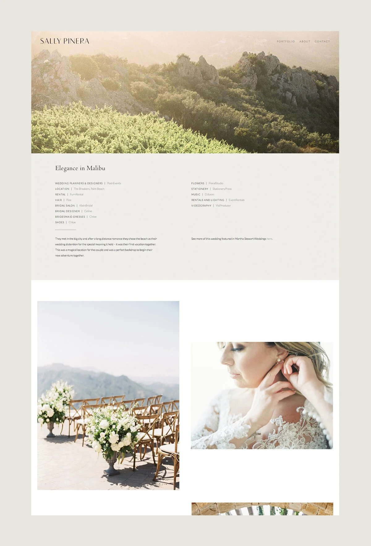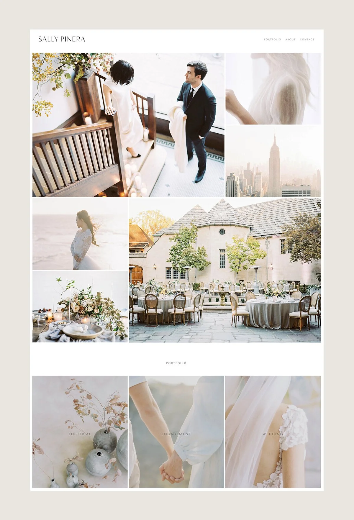 Sally Pinera is a Los Angeles wedding photographer with a soft and timeless aesthetic. We developed an elegant logo and identity inspired by the sharp details of a calligraphic pen for a tailored, textural and refined look. We designed and developed a Squarespace website to show photo layouts that feel full screen and carefully balanced.